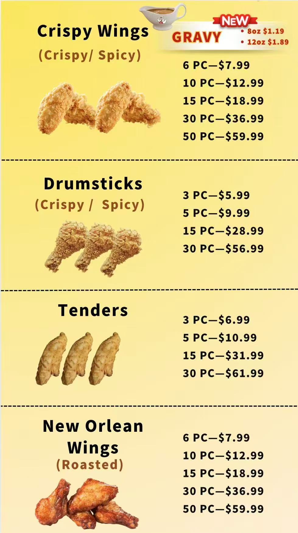| 5 | 3PC DRUMSTICKS • Crispy • Spicy | $8.99 | $11.99 |