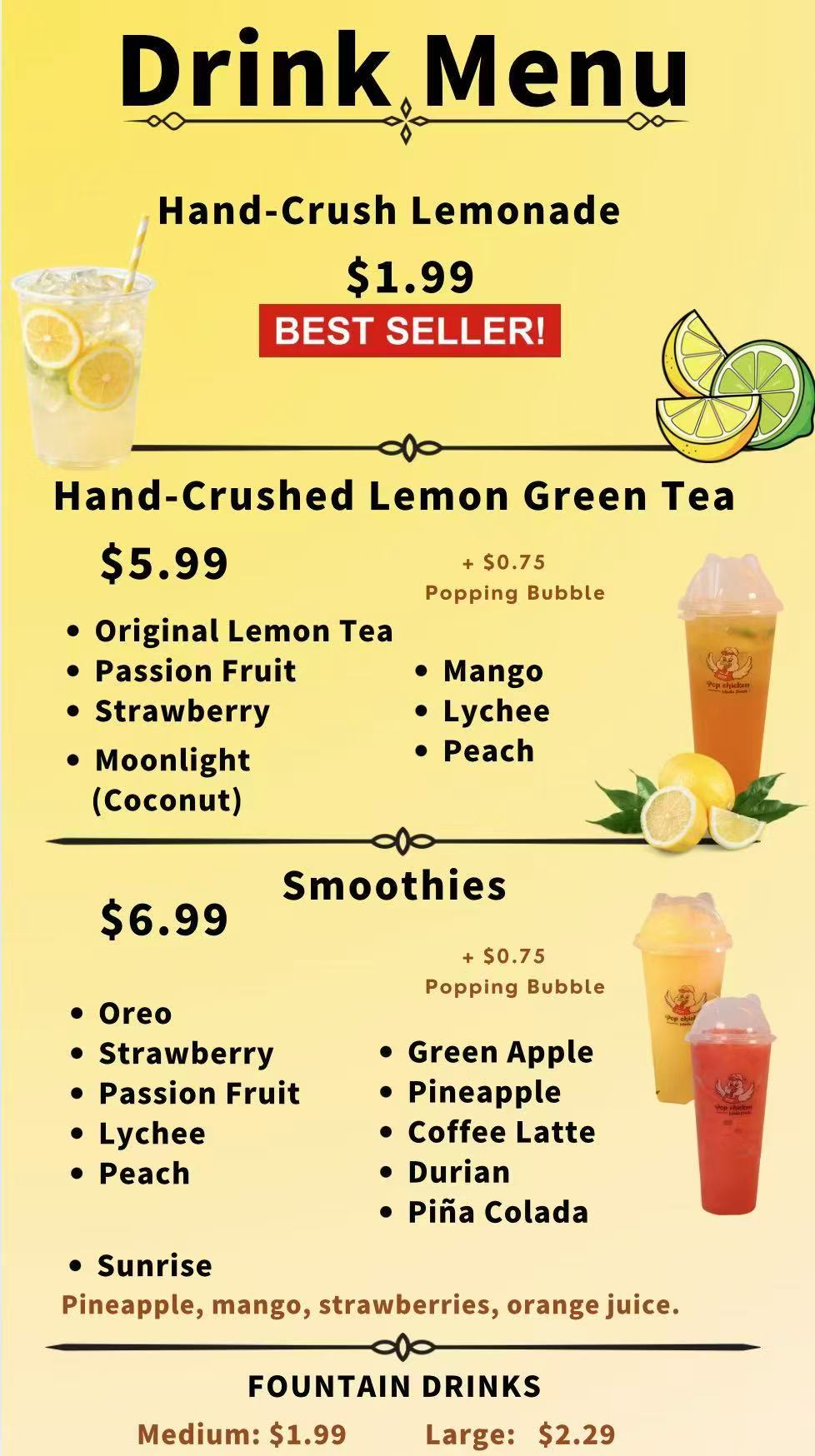 The overall design is brand-aligned with Pop Chicken’s casual, approachable aesthetic: it’s not overly formal, but still polished, with a focus on making the drinks look desirable while ensuring menu information is accessible. The combination of appetizing visuals and structured text serves a dual purpose: to entice customers with the drinks’ freshness and variety, and to help them quickly make decisions by highlighting bestsellers, prices, and customization options. Every element—from the garnished glasses to the bold “BEST SELLER!” label—works to position these beverages as essential, refreshing companions to Pop Chicken’s main menu.