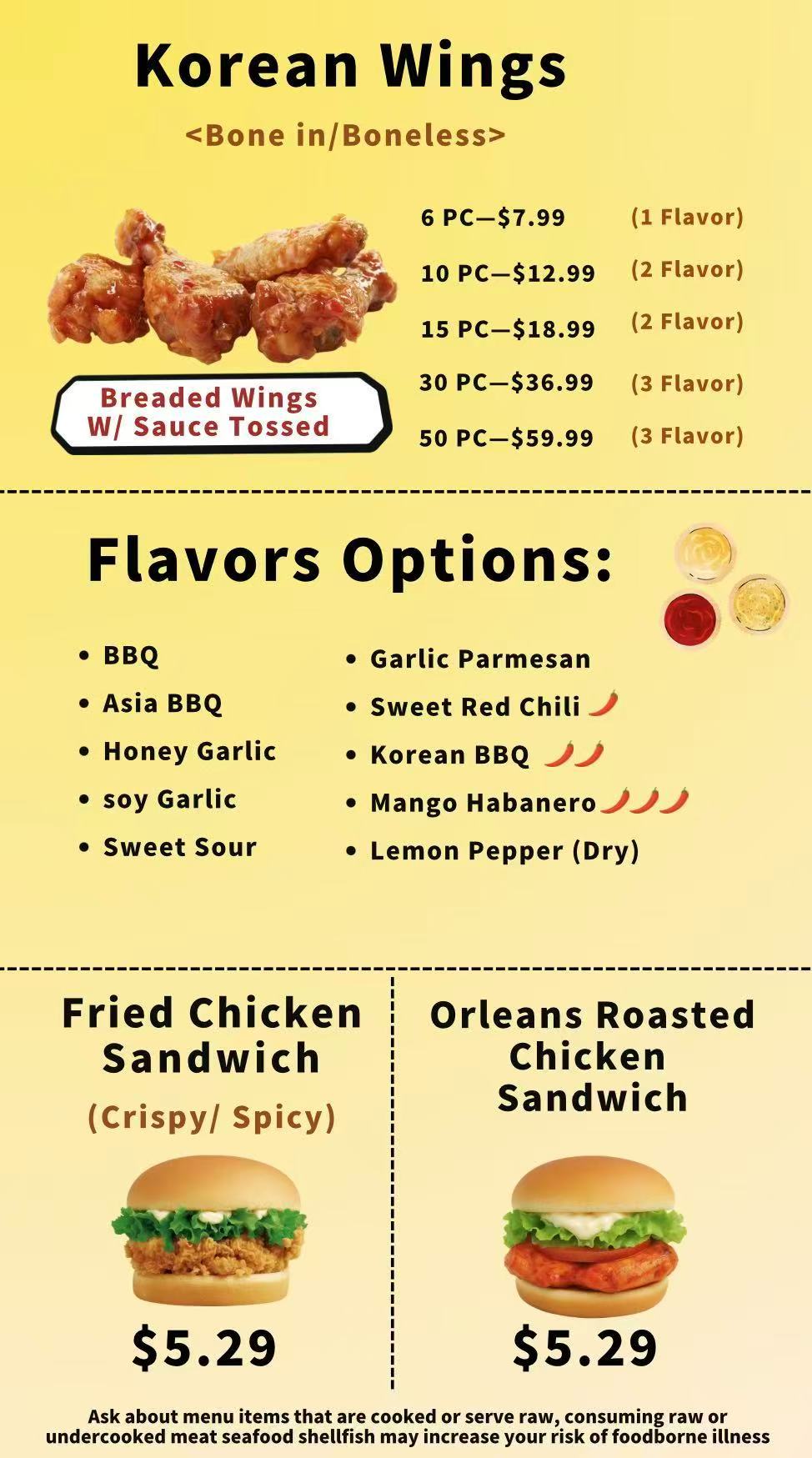 - Customization (e.g., “<Bone In / Boneless>” for Korean Wings, “1 Flavor Option” to reference the brand’s existing sauce lineup)