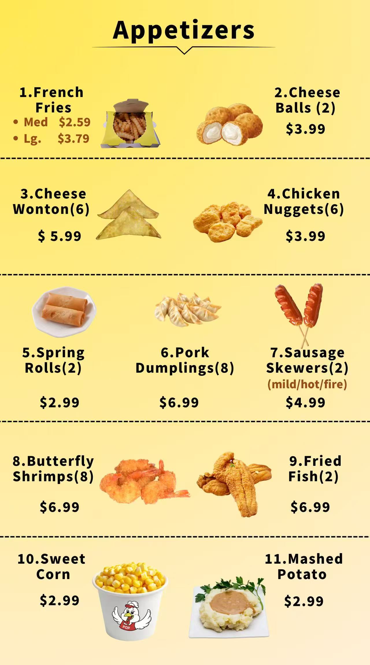 | 4 | 2PC FRIED FISH | $9.99 | $12.99 |