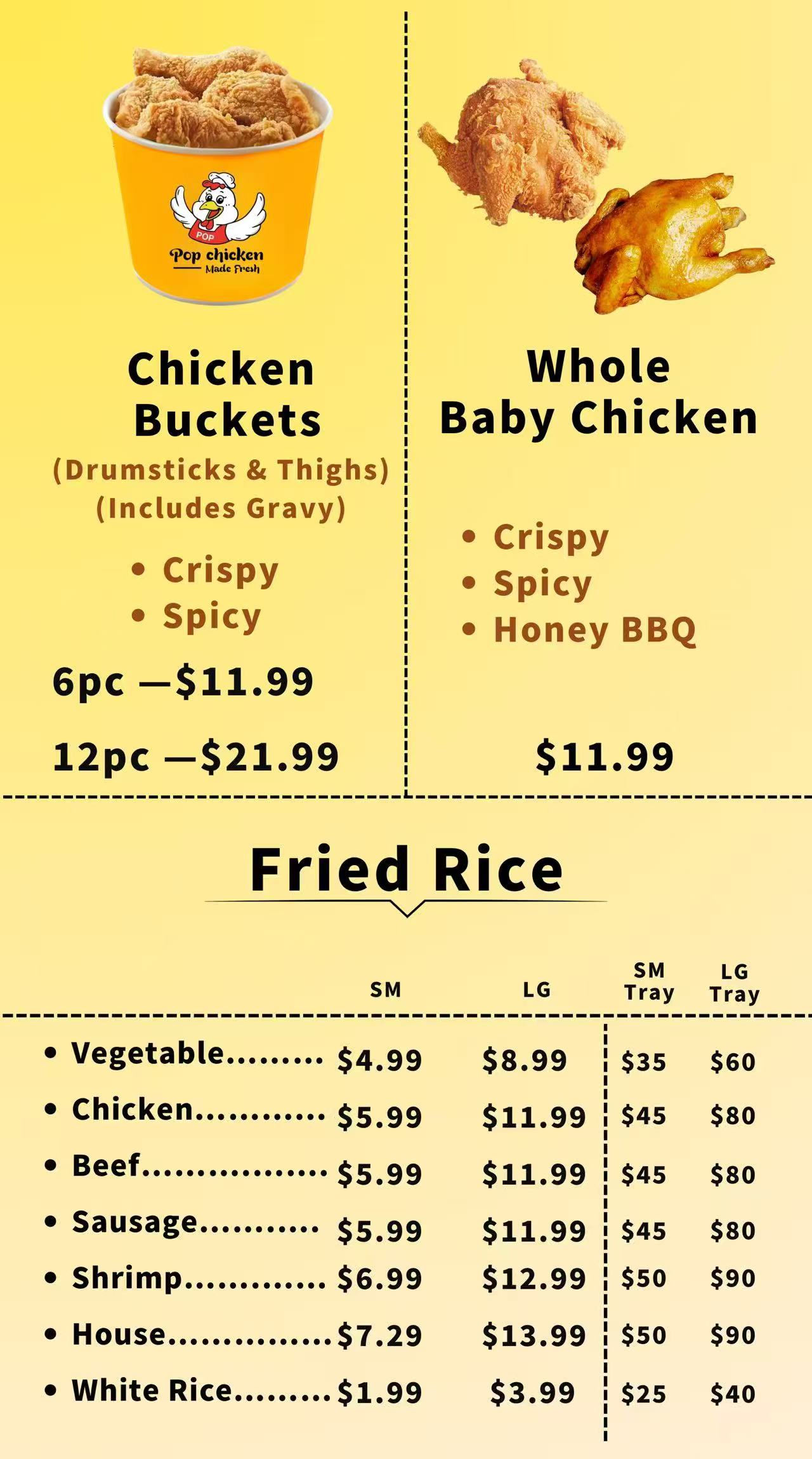 - Chicken Fried Rice: SM Tray $5.99 | LG Tray $11.99 | Bulk Tray $45 | Extra-Large Bulk Tray $80
